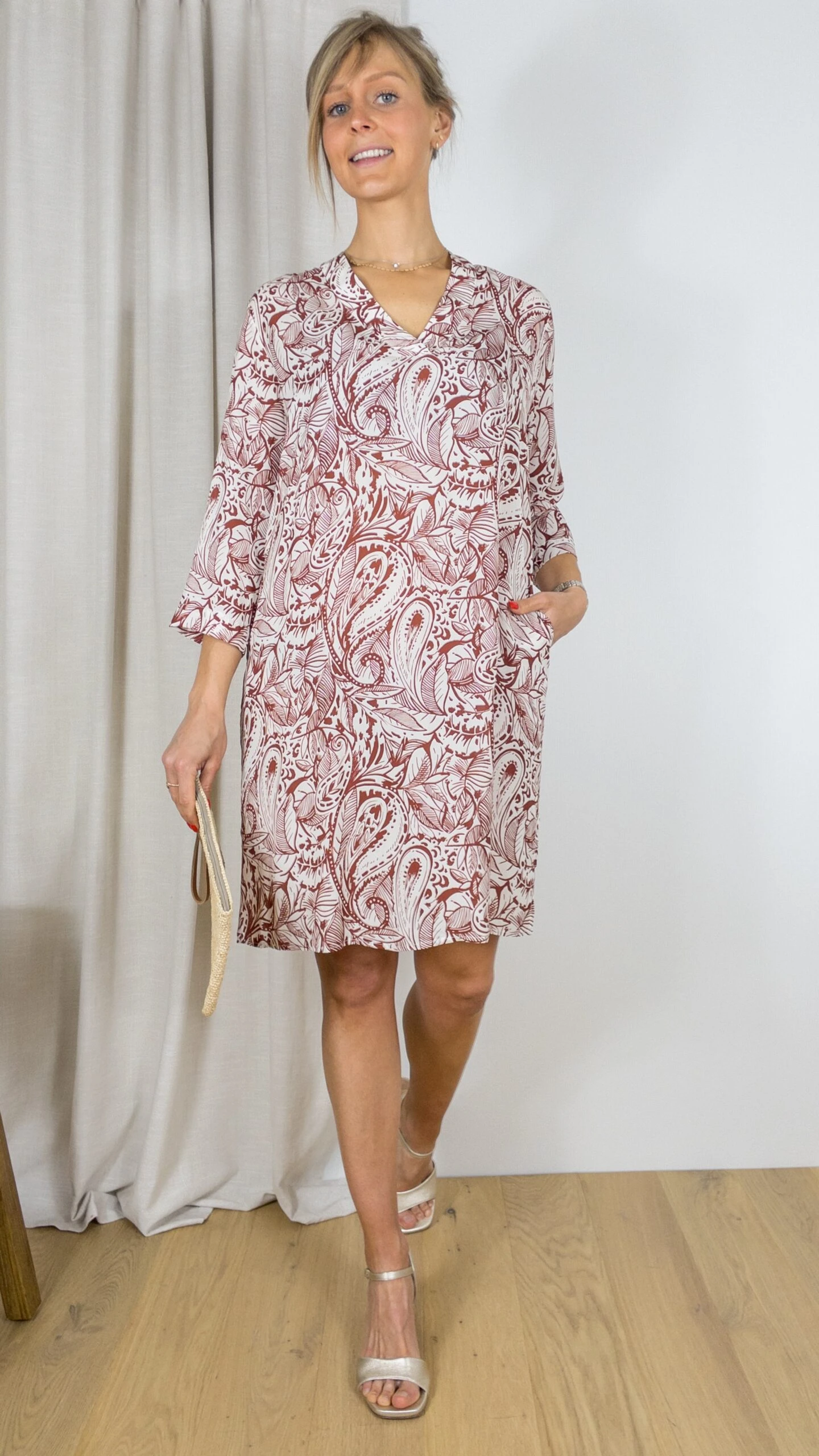 Robe imprimée Découvrez notre superbe robe habillée S1351C Anna Savarelli. Sa coupe droite vous offre un look élégant et sophistiqué. Fabriquée à partir de tissus de haute qualité, cette robe offre une coupe droite flatteuse, parfaite pour toutes les morphologies. Le motif imprimé brique est tendance et accrocheur, ajoutant une touche de sophistication à cette robe habillée.Cette robe habillée droite imprimée brique est idéale pour les occasions spéciales, que ce soit pour un mariage, une soirée de gala ou une soirée cocktail. Description Coupe droite Longueur genoux Col V 2 poches Conseil et taille Bertille mesure 1.78m et porte la taille 38 avec les chaussures MORATY Unisa. Le produit taille normalement, nous vous recommandons de prendre votre taille habituelle. Composition et entretien 100% Viscose Lavage 30° Essorage 600 La viscose La viscose est une matière conçue à partir de cellulose naturelle. Un filage humide permet sa production. Une viscose peut être mat ou brillante en fonction de la volonté et des procédés du créateur. Son apparence peut être trompeuse, et vous donner l’impression de porter de la laine, de la soie ou du coton. La viscose est une matière légère, douce et cache l’odeur de transpiration. La viscose se lave facilement à 30 degrés avec un faible essorage à 600 tours et un léger repassage. Voir toute la sélection de ce fournisseur https://windownext.com/collections/anna-seravalli La marque Anna Seravalli est une marque italienne, plus précisément de Venezia créée en 1986. Dans toutes leurs collections, ils allient tradition de la couture et amour de la création. C’est une marque proposant une ligne de mode féminine au design soigné confectionné à partir de matières nobles et naturelles. 014980 ROBE ANNA SAVARELLI S1351C