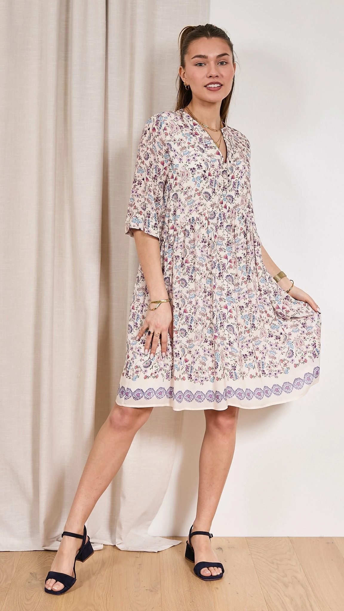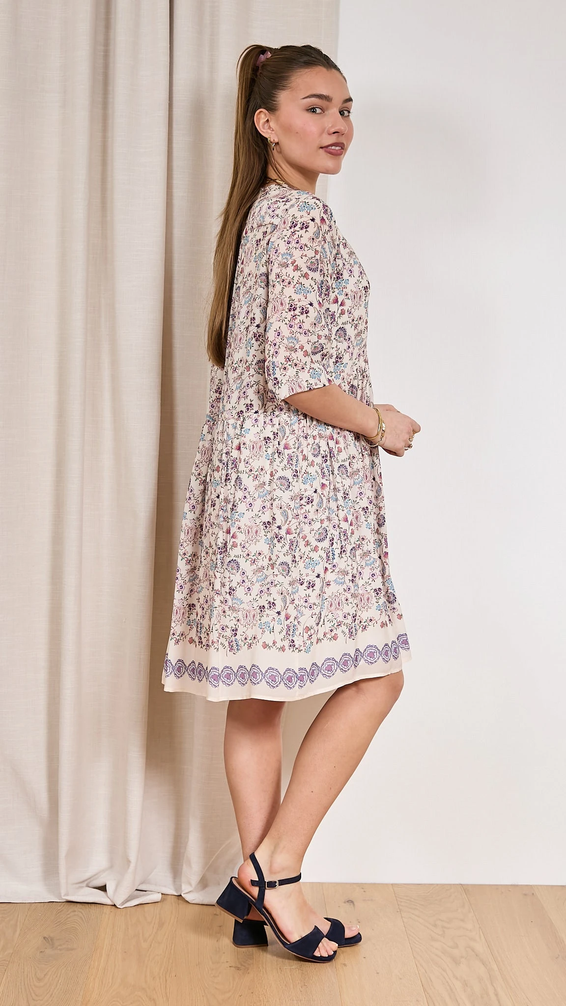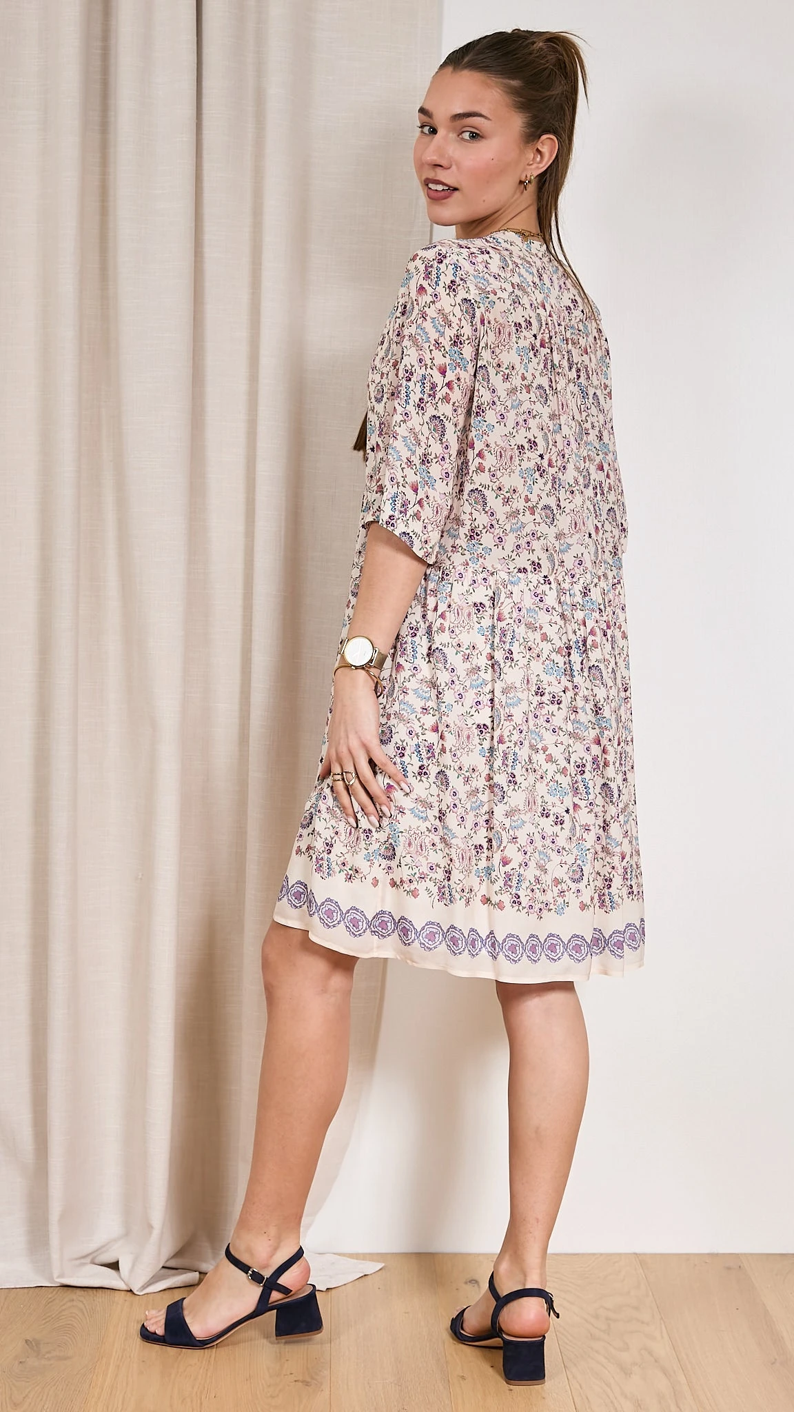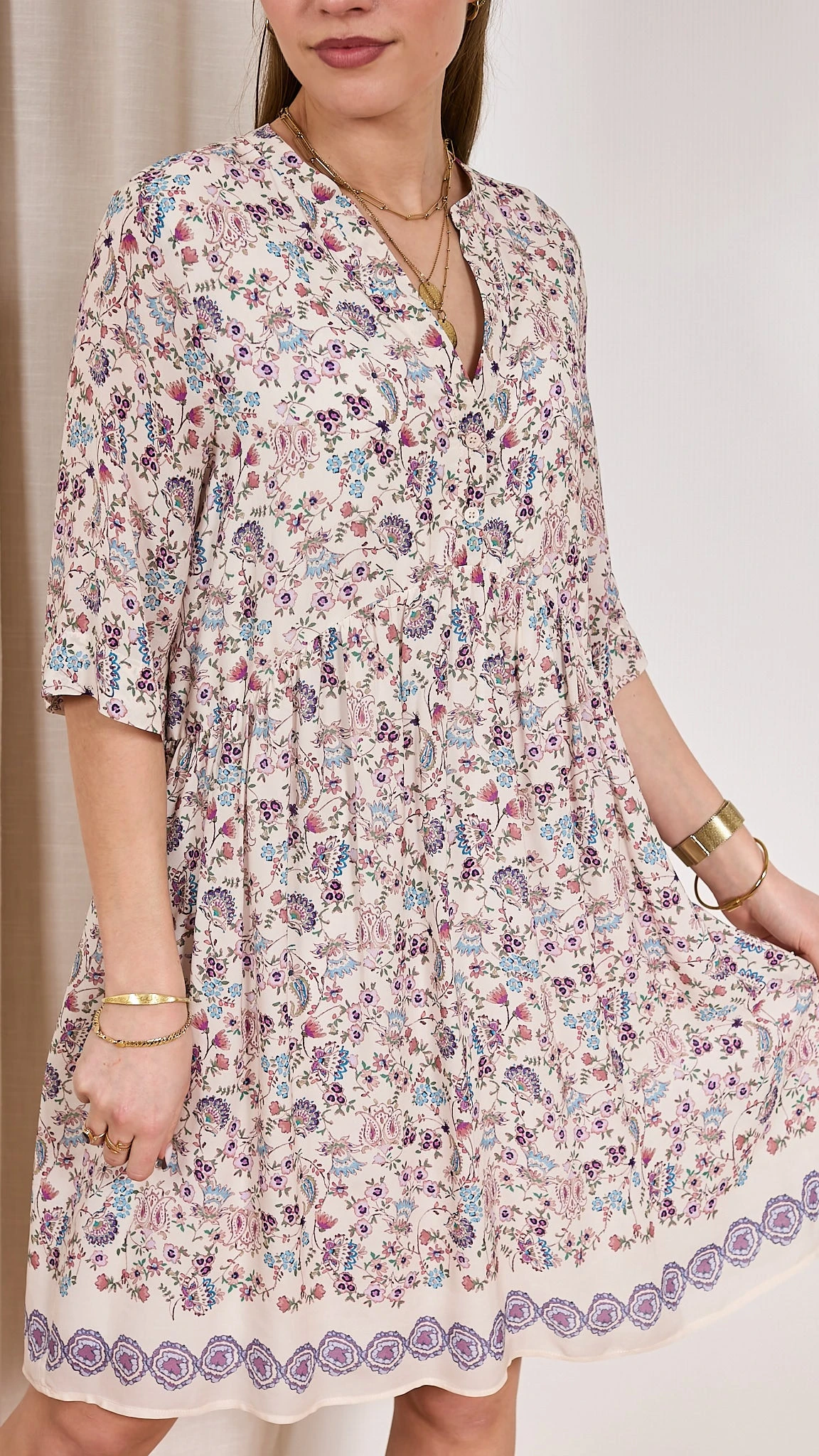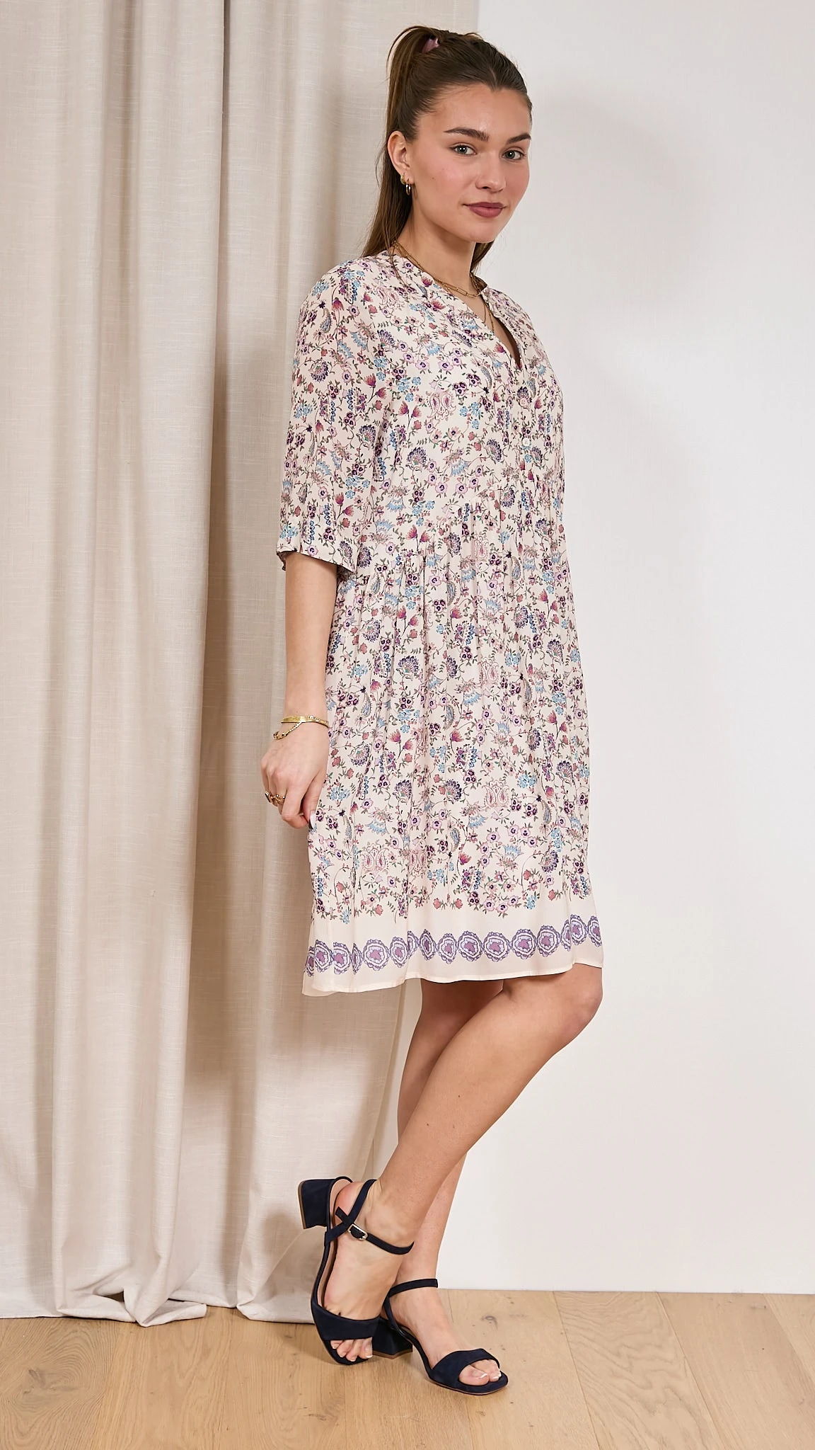Robe imprimée On aime l’imprimé fleuri de la robe RUPERT Pablo. L’encolure tunisienne apporte une touche féminine à votre robe. La coupe droite convient à toutes les femmes. C’est un basique à avoir dans votre vestiaire d’été ! Chic et élégant sont les maîtres mots de cette pièce. Description Manches courtes Imprimée Fluide Col tunisien Fronces Conseil et taille Elisa mesure 1.61m et porte la taille 1 avec les sandales Unisa. Le produit taille assez grand, si vous êtes entre 2 tailles nous vous conseillons de prendre la plus petite. Taille du produit 1 2 3 Equivalence française 38-40 40-42 42-44 Composition et entretien 100% Viscose Lavage 30° Essorage 600 La viscose La viscose est une matière conçue à partir de cellulose naturelle. Un filage humide permet sa production. Une viscose peut être mat ou brillante en fonction de la volonté et des procédés du créateur. Son apparence peut être trompeuse, et vous donner l’impression de porter de la laine, de la soie ou du coton. La viscose est une matière légère, douce et cache l’odeur de transpiration. La viscose se lave facilement à 30 degrés avec un faible essorage à 600 tours et un léger repassage. Voir toute la sélection de ce fournisseur https://windownext.com/collections/pablo La marque Pablo est la « petite sœur » de la marque française Gérard Darel. Créée en 1971, c’est une marque proposant des collections plus jeunes et tendances à prix agréables ! Elle revendique l’élégance depuis des décennies grâce à ses ateliers au cœur de Paris. C’est la marque dédiée aux jeunes femmes modernes, confiantes qui aiment la mode ! Référence fournisseur: PXR93 X711 014350 ROBE PABLO RUPERT